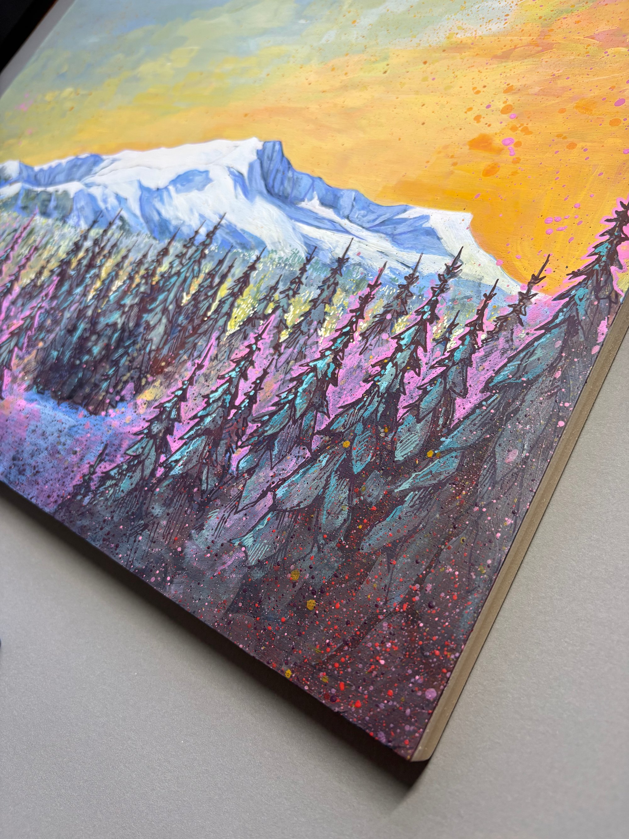 It's painted on a wooden panel mounted to a wooden subframe, ready to hang on the wall.